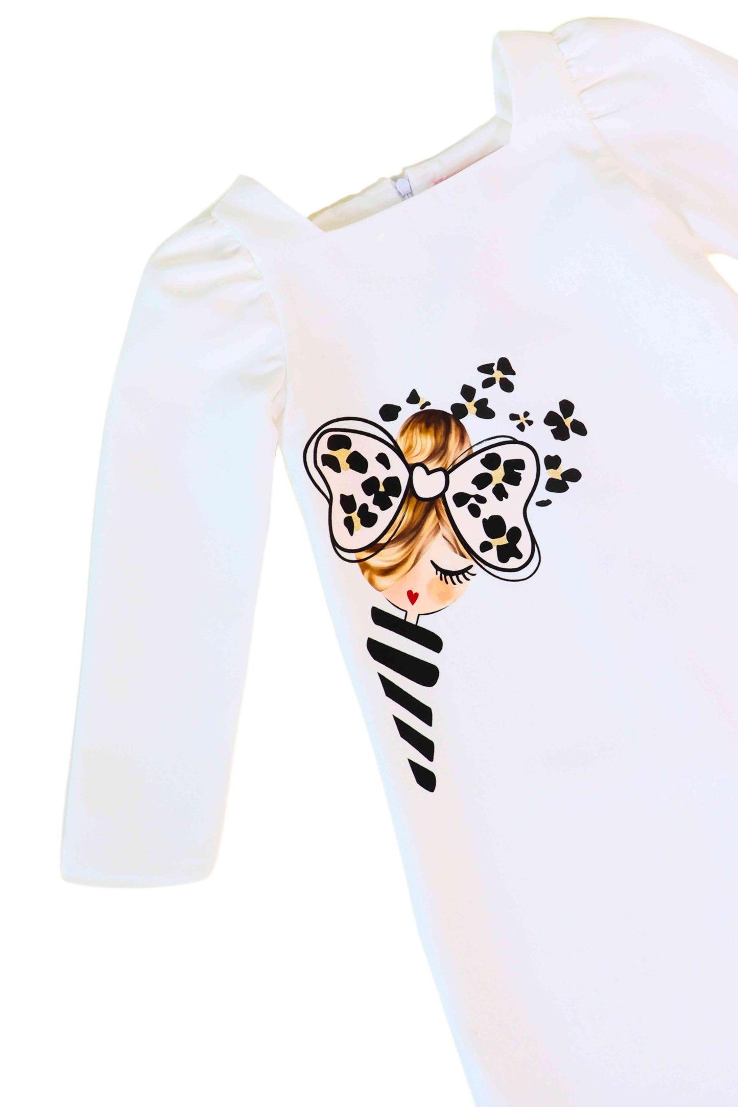 Una batita en tono blanco de manga larga con corte recto y largo a la rodilla. El diseño destaca por un estampado frontal.